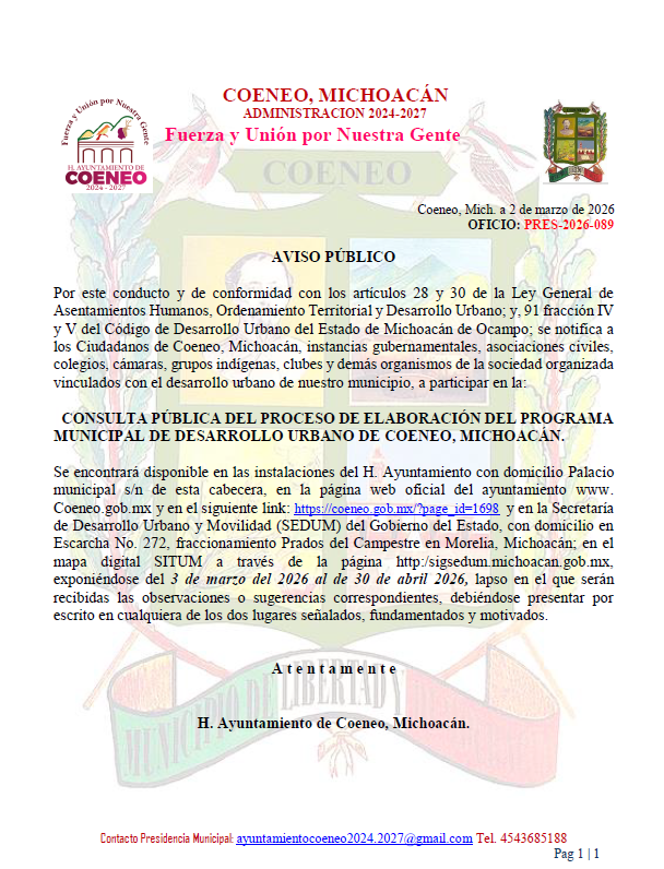 ¡Bienvenidos al Portal Ciudadano del Ayuntamiento de Coeneo! Este espacio ha sido diseñado para acercar a la comunidad toda la información, servicios y recursos que el municipio pone a disposición de sus habitantes. Aquí podrás realizar trámites, consultar noticias locales, conocer eventos culturales y participar activamente en el desarrollo de nuestro querido Coeneo. Estamos comprometidos con la transparencia, la eficiencia y la mejora continua para servirte mejor. ¡Explora, infórmate y haz de este portal tu herramienta para estar más cerca de tu municipio!